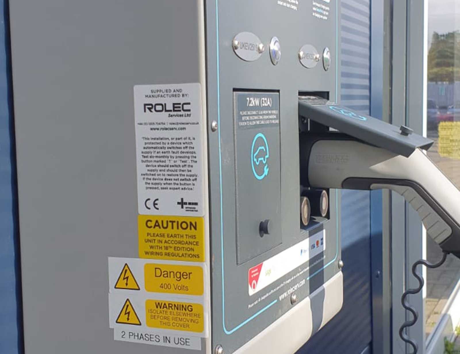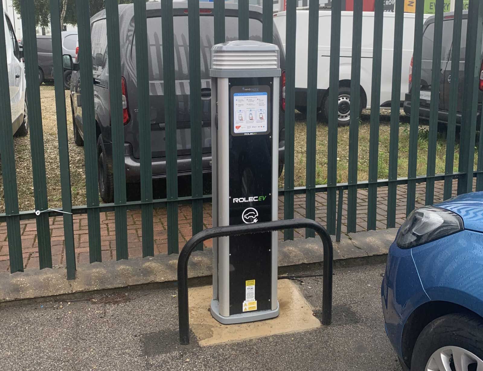 The project involved installing dual 7.2kW Rolec pedestal EV charge points, connected via a new dedicated EV distribution board and full compliance with BS7671 wiring regulations.